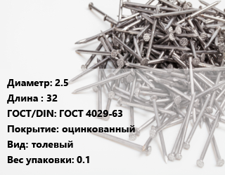 Гвоздь 2.5х32 ГОСТ: ГОСТ 4029-63 оцинкованный толевый 0.1