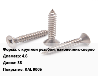 Саморез с крупной резьбой, наконечник-сверло D=4.8 L=38 RAL 9005, шт цена от 2.88 Р / кг, где купить, условия доставки в Гомеле и Гомельской области