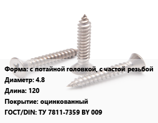 Саморез с потайной головкой, с частой резьбой D=4.8 L=120 оцинкованный ГОСТ: ТУ 7811-7359 BY 009