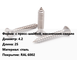 Саморез с пресс-шайбой, наконечник-сверло D=4.2 L=25 сталь RAL 6002, шт цена По запросу где купить, условия доставки в Гомеле и Гомельской области