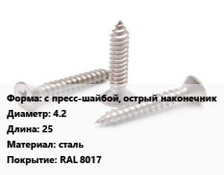 Саморез с пресс-шайбой, острый наконечник D=4.2 L=25 сталь RAL 8017, упаковка 1000 шт цена от 404.54 Р / кг, где купить, условия доставки в Гомеле и Гомельской области