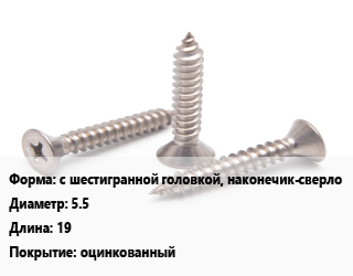 Саморез с шестигранной головкой, наконечик-сверло D=5.5 L=19 оцинкованный
