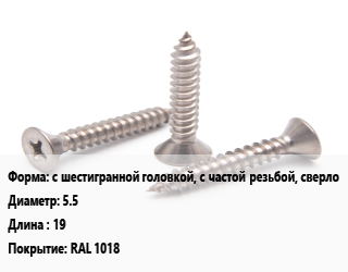 Саморез с шестигранной головкой, с частой резьбой, сверло D=5.5 L=19 RAL 1018