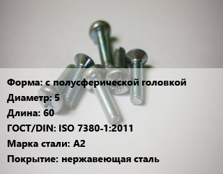 Винт с полусферической головкой 5х60 ISO 7380-1:2011 Сталь: A2 нержавеющая сталь, цена за шт, кг цена от 34.2 Р / кг, где купить, условия доставки в Гомеле и Гомельской области