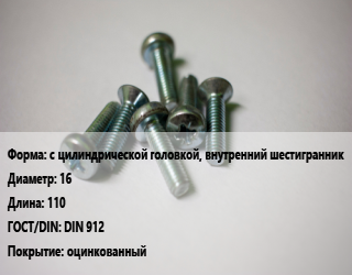 Винт с цилиндрической головкой, внутренний шестигранник 16х110 DIN 912 оцинкованный, 8.8, цена за 1000 шт, кг цена от 132.63 Р / кг, где купить, условия доставки в Гомеле и Гомельской области