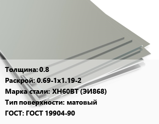 Лист нержавеющий 0.8 0.69-1х1.19-2 Сталь: ХН60ВТ (ЭИ868) Тип:матовый ГОСТ 19904-90