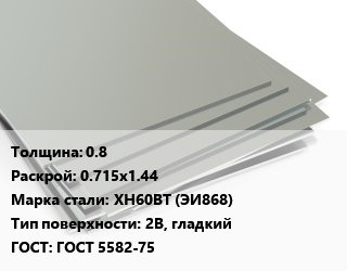 Лист нержавеющий 0.8 0.715х1.44 Сталь: ХН60ВТ (ЭИ868) Тип:2B, гладкий ГОСТ 5582-75, м2 цена от 1 632 Р / т, где купить, условия доставки в Гомеле и Гомельской области