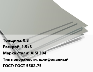 Лист нержавеющий 0.8 1.5х3 Сталь: AISI 304 Тип:шлифованный ГОСТ 5582-75