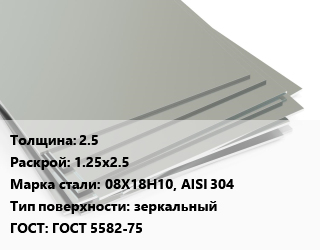 Лист нержавеющий 2.5 1.25х2.5 Сталь: 08Х18Н10, AISI 304 Тип:зеркальный ГОСТ 5582-75