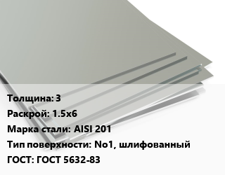 Лист нержавеющий 3 1.5х6 Сталь: AISI 201 Тип:No1, шлифованный ГОСТ 5632-83